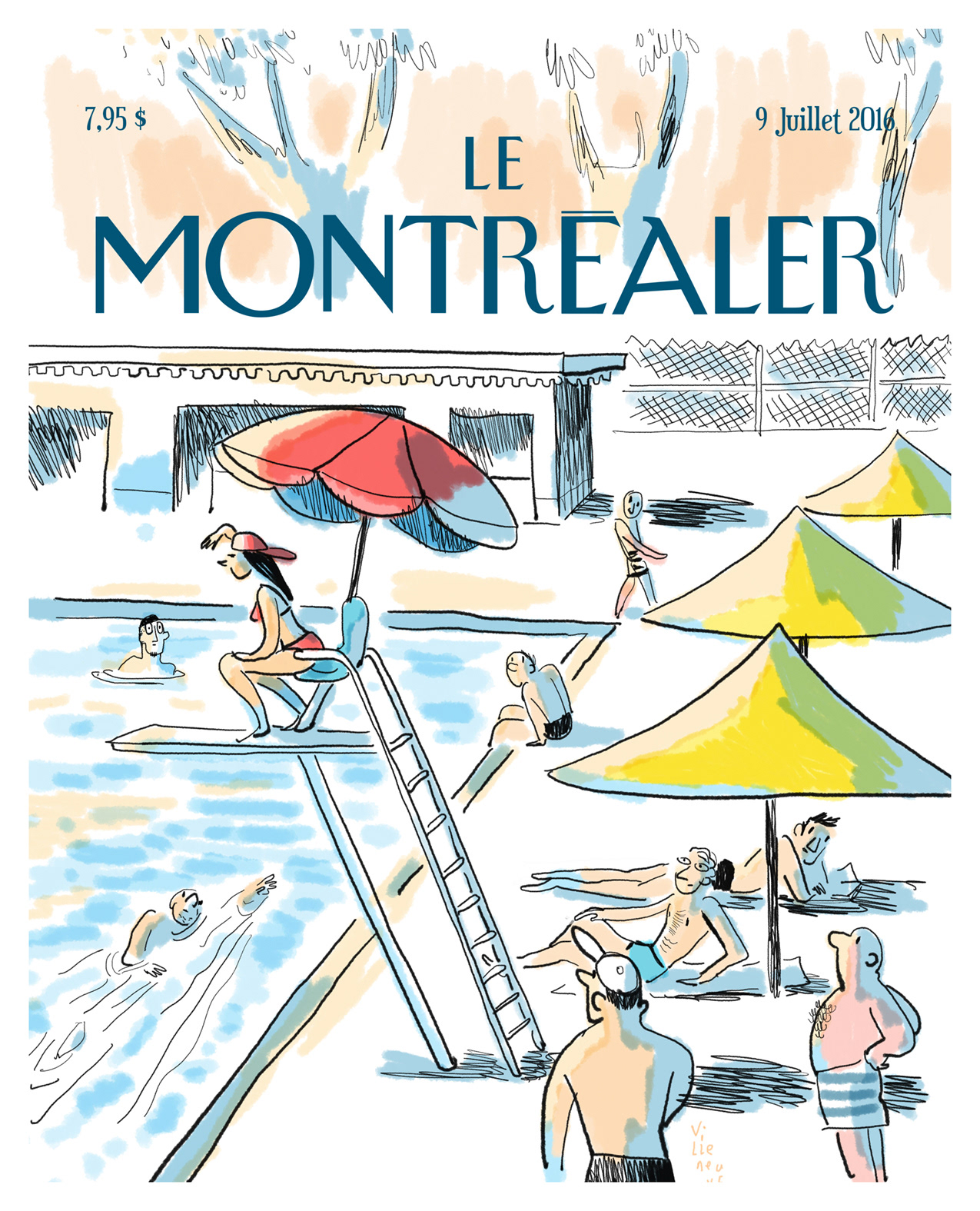 J’ai tout d’abord pensé aux moments qui me sont les plus chers, vécus dans ma ville. Il était sûr que mon illustration se passerait lors d’une tempête de neige ou lors d’une grande canicule ; deux moments où la ville s’arrête, et cela m’émeut particulièrement. J’étais à la piscine et, en observant le joli cirque autour de moi, l’idée m’est venue des regards des hommes sur cette jolie sauveteuse qui veille sur les baigneurs. Ça me plaisait de montrer la séduction qui flotte doucement par temps chaud dans ma ville.