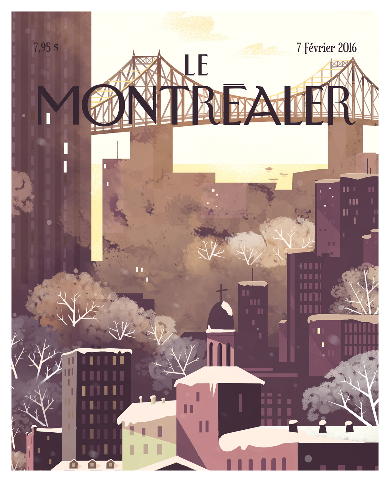 J’ai accepté de participer au projet, car l’idée de faire partie d’une exposition célébrant la ville de Montréal, ses beautés et ses particularités me plaisait beaucoup. Avec cette illustration, j’ai voulu représenter la profondeur d’un matin glacial qui se lève sur la ville, avec en arrière-plan le pont Jacques-Cartier qui relie Montréal à la ville de Longueuil sur la Rive-Sud. Par la suite, elle est devenue une carte de souhaits illustrant l’hiver montréalais. J’ai d’abord fait des recherches photographiques sur l’architecture et les ponts de la ville et, après plusieurs croquis de composition et tests d’ambiances givrées, voilà le résultat !