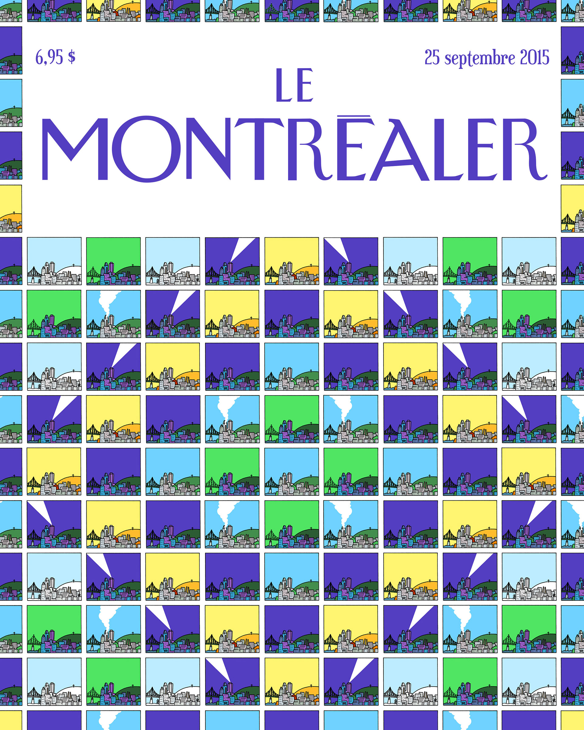 Montréal est une ville que j’aime énormément, même si je n’y ai habité que deux ans. Je suis aussi un grand admirateur des couvertures du New Yorker. J’aime l’idée de la mosaïque, qui représente très bien Montréal avec ses couleurs diverses et son rythme unique. J’ai souhaité représenter différents moments de la ville, à partir d’une vue plutôt emblématique, soit le pont Jacques-Cartier, le mont Royal et le quartier des affaires. On y voit l’hiver, l’automne et l’été. Le faisceau lumineux de la Place Ville-Marie, tout aussi emblématique, participe aussi à la construction de l’image.