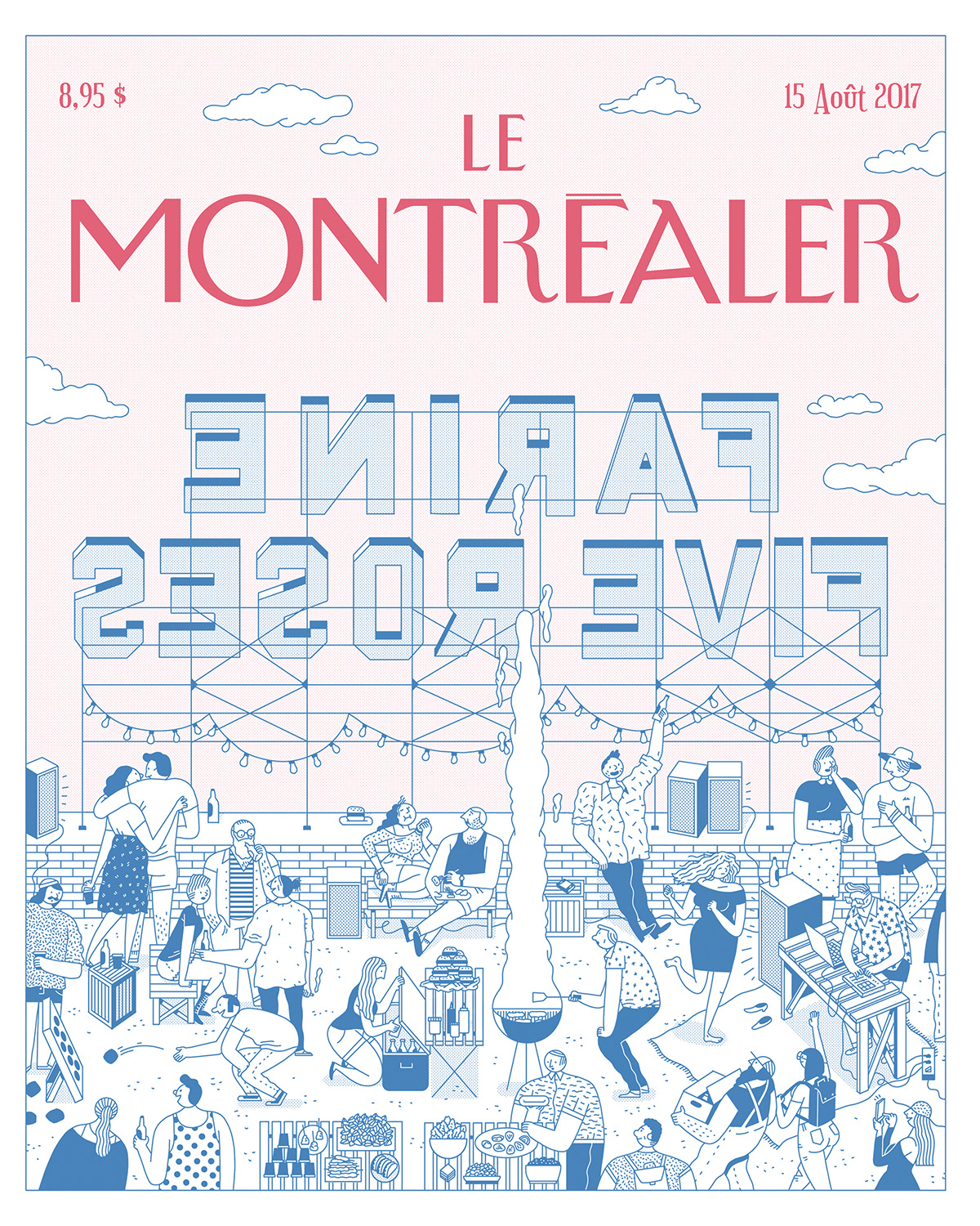 Je souhaitais représenter Montréal comme cette ville se présente à moi : énergique et imprévue. Dans mon oeuvre, l’édifice Farine Five Roses agit comme une représentation du patrimoine de Montréal. Mais à son envers on voit une grande fête, un rassemblement. L’historique et l’ancestral rencontrent l’actuel et le vivant. C’est une façon simple de prendre une icône de la ville et de la présenter sous un nouvel angle, la rendre accessible et grouillante de vie.