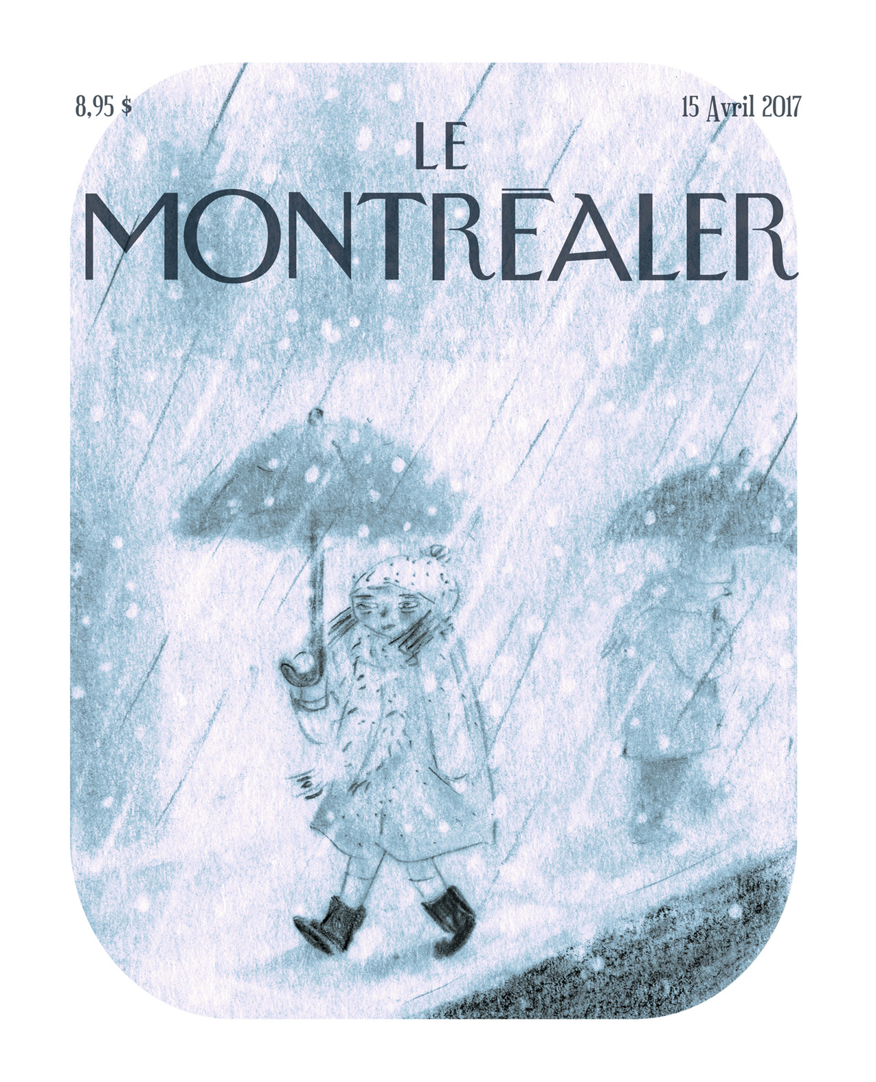 Ayant créé cette illustration en février, j’étais déjà très inspirée par la météo du moment où se mélangeaient neige mouillée, parapluies, bottes d’hiver et temps gris. J’ai utilisé un mélange de crayons à mine et pastels secs.