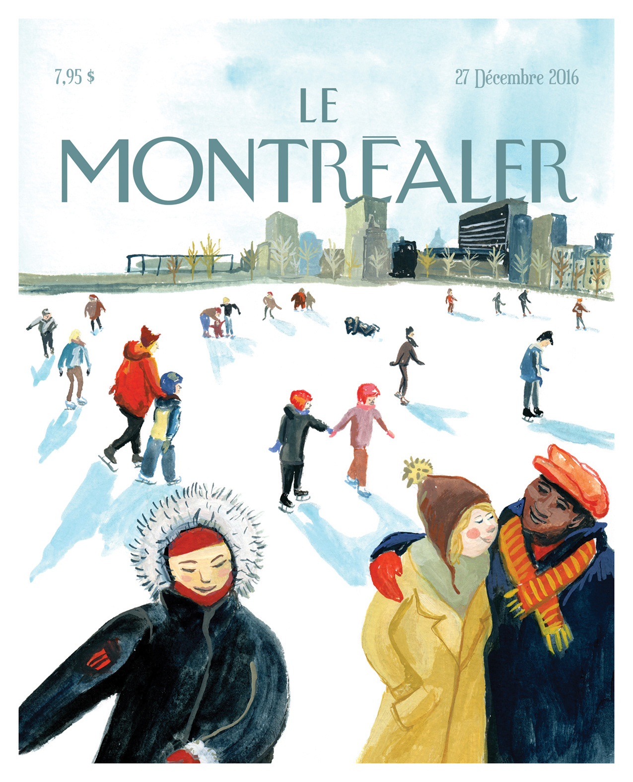 Lorsque j’ai habité deux années en Europe, c’est la lumière de l’hiver montréalais qui me manquait surtout. Cette lumière aveuglante d’après-midi si particulière à l’hiver. Quand j’ai été approchée pour le projet, c’était clair pour moi que je voulais illustrer un après-midi en patins dans le Vieux-Montréal.