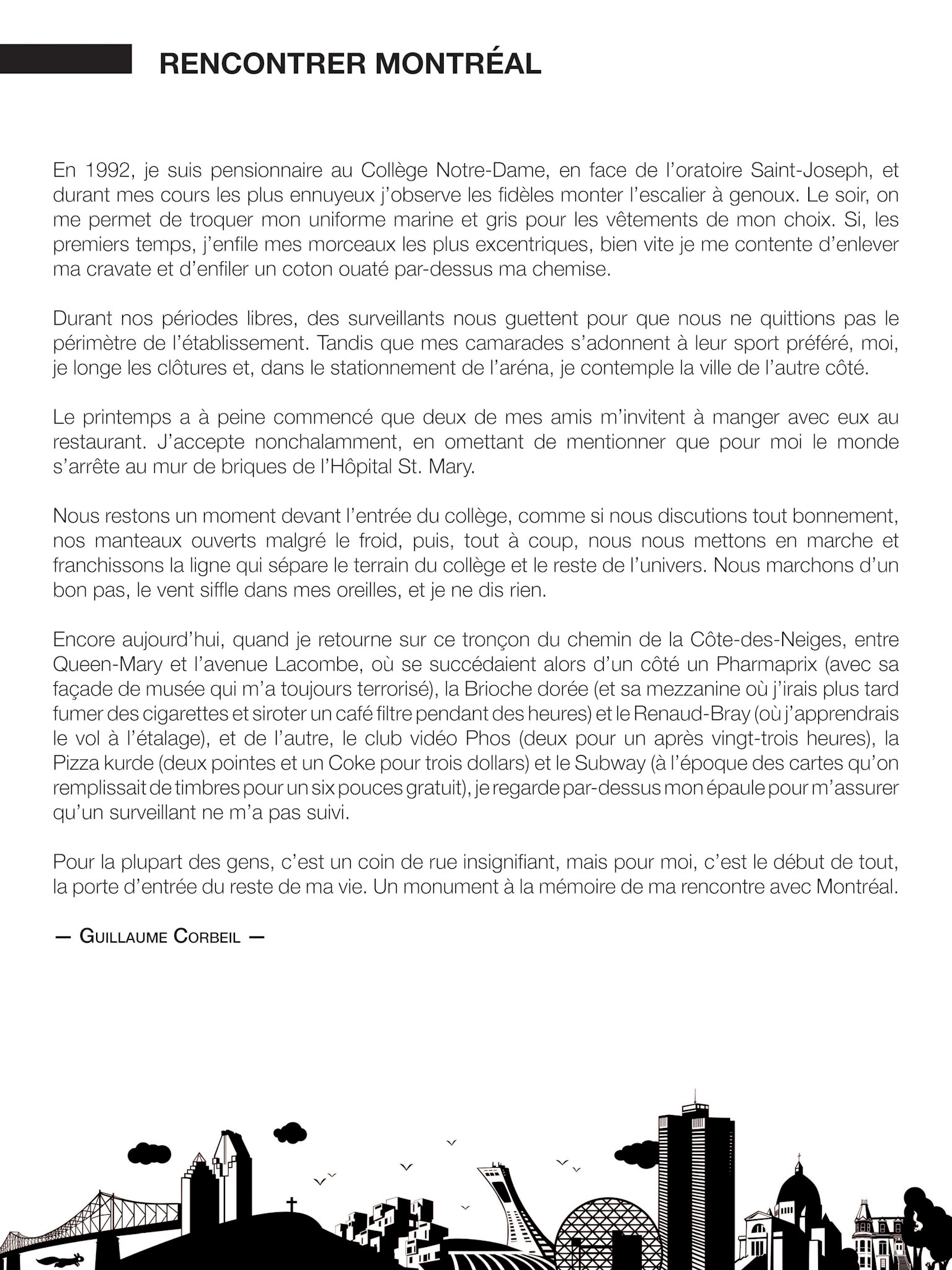 Dans son texte, l’auteur nous amène dans son enfance, à l’époque du collège qui lui fait découvrir pour la première fois la ville. Ce coin de ville, ce quartier, où il fera ces premières expériences. Une étape charnière qui définira l’homme qu’il deviendra. Pour l’auteur, Montréal, c’est le collège pour garçons, l’adolescence, mais aussi la vie de quartier avec ses commerces, ses amis et les rencontres que l’on fait.