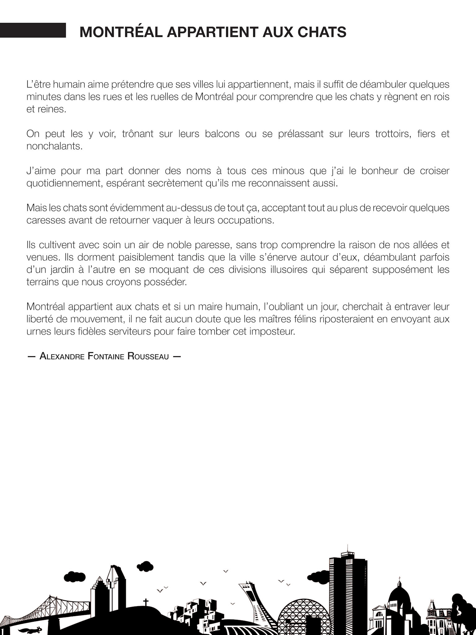 Dans son court texte, l’auteur nous rappelle que les villes quelles qu’elles soient, appartiennent avant tout aux chats. Ils y sont les maîtres et nous pouvons les apercevoir à chaque coin de rue. C’est son amour pour le genre félin qui lui permet de partager avec nous cette vision. Il nous rappelle d’ailleurs sa passion de leur octroyer des noms en espérant un jour que l’un d’eux se souviendra de lui. Il est agréable de constater que Montréal est également une ville ouverte aux animaux et qu’ils y sont les bienvenus. Ils font partie du quotidien de beaucoup d’habitants. Parfois discrets, parfois imposants, ils sont là pour rester.