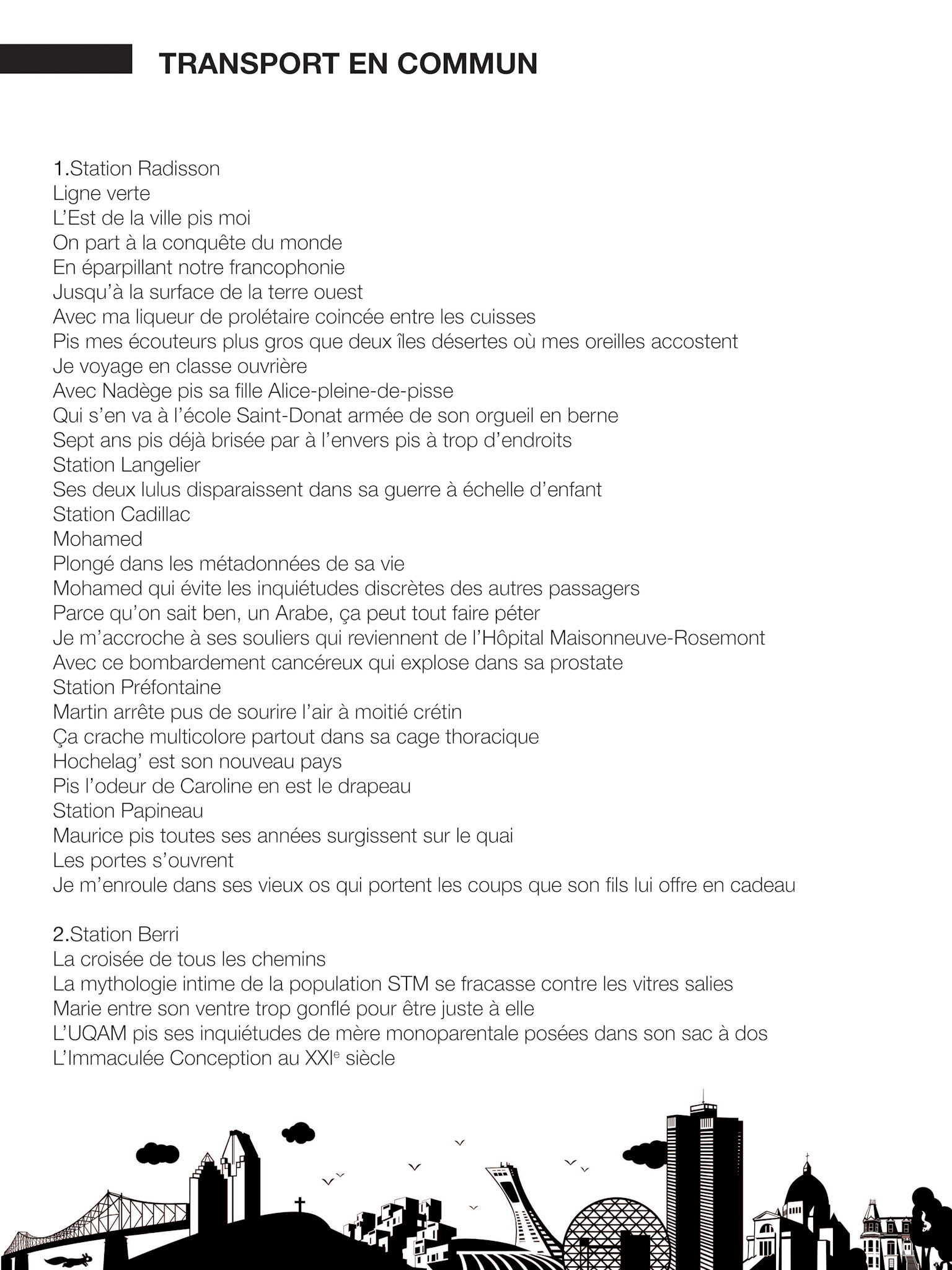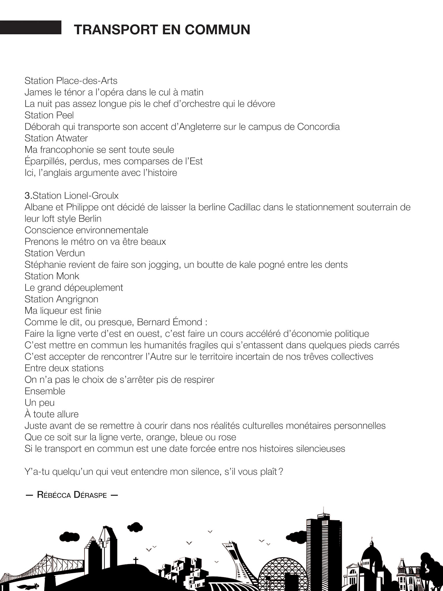 Dans cette succession de rencontres, l’autrice nous dresse un éventail des rencontres improbables que lui offre le trajet sur la ligne verte du métro de Montréal. D’est en ouest, les vies et les rêves se croisent. Elle nous fait découvrir la réalité des milliers de gens qui forment Montréal. Chacun allant à son rythme, mais avec le même objectif, celui d’avancer, de toujours aller de l’avant. Son regard cynique de la réalité nous rappelle que la vie n’est pas toujours aussi bonne pour chacun d’entre nous et que nous avons tous des défis à relever. Elle nous rappelle aussi que Montréal appartient à tous et que le métro est le moyen idéal pour découvrir les vrais Montréalais, l’espace d’un trajet.