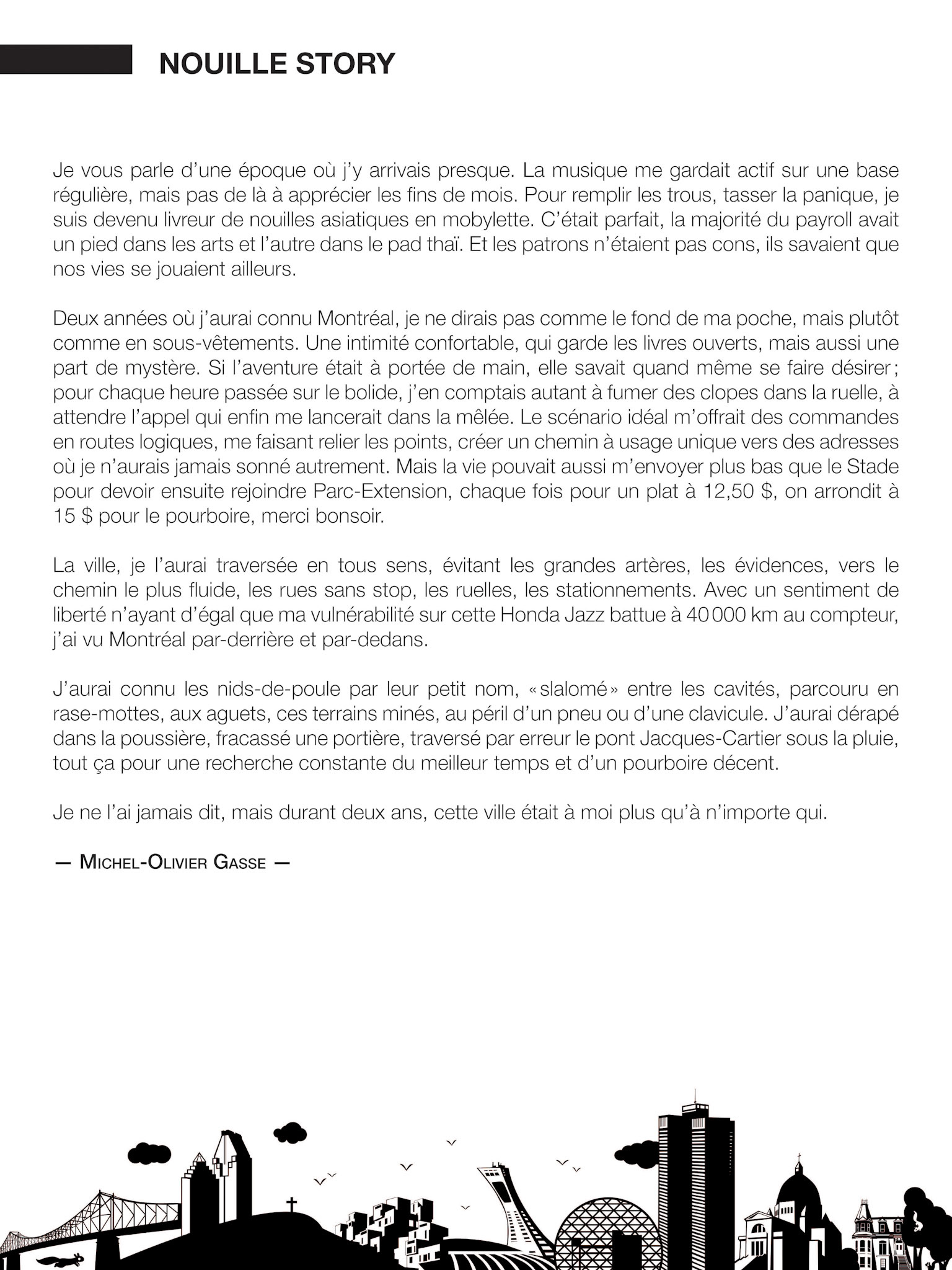 Né en Gaspésie l’année du punk, puis élevé en Estrie 10 ans plus tard, Michel-Olivier Gasse a d’abord, comme bien des gens, eu peur de Montréal avant de l’habiter pour l’aimer 20 années durant. Mais comme chaque chose a une fin, il l’a quittée — sans rancune — pour mener une vie à la campagne où il cultive des légumes, les chansons de son groupe, Saratoga, et son enfant neuf qui sent encore le petit lait. Quand il retourne à Montréal, il chiale sur le parking et les bouchons comme un bon gars de région, mais c’est pour la forme.
