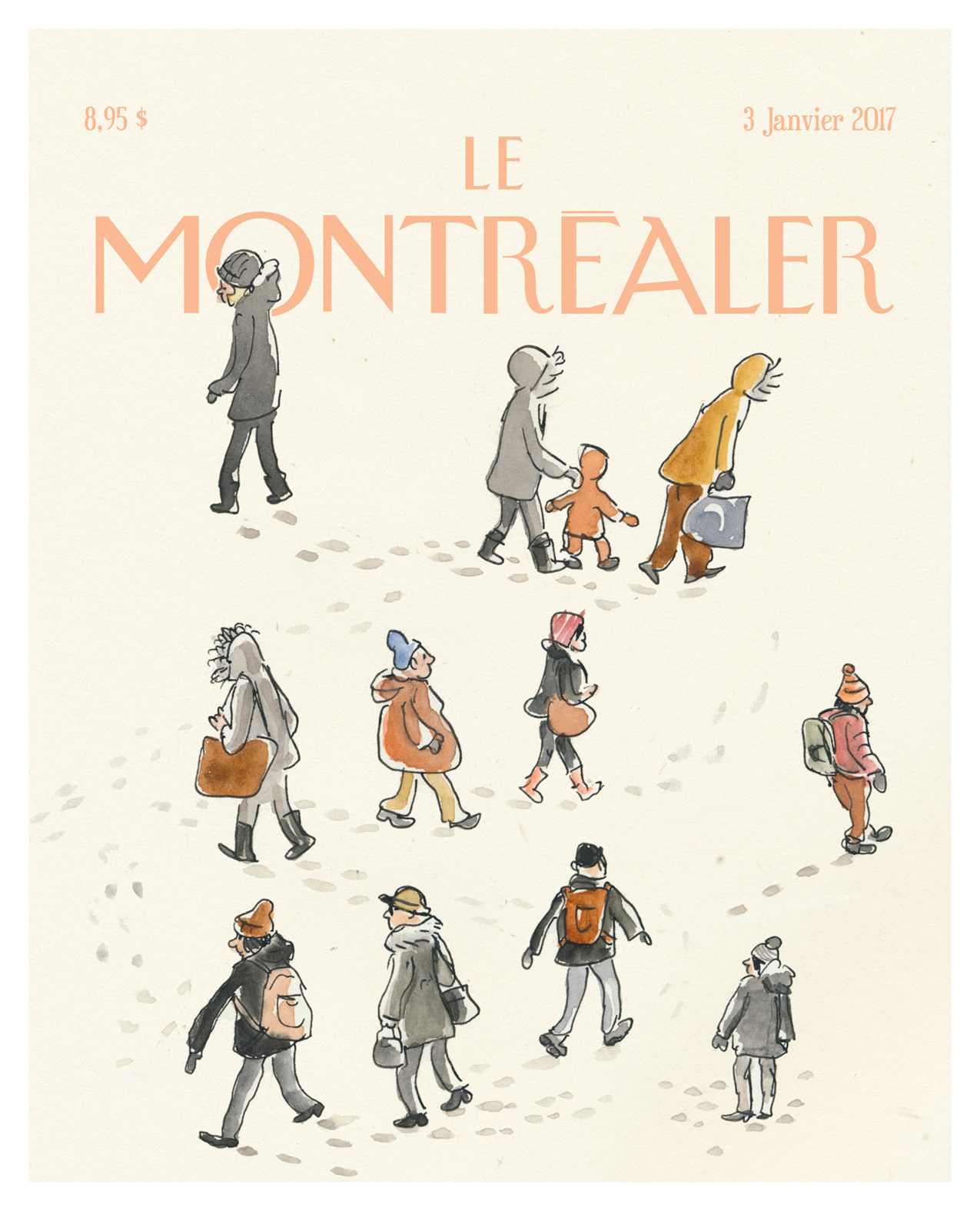 Je trimballe toujours un carnet à croquis. C’est une pratique qui influence beaucoup mon travail. J’essaie de dessiner tout ce qui m’entoure. Les personnages que l’on voit dans mon illustration ont été dessinés de la fenêtre de mon appartement, au cours d’une journée enneigée.