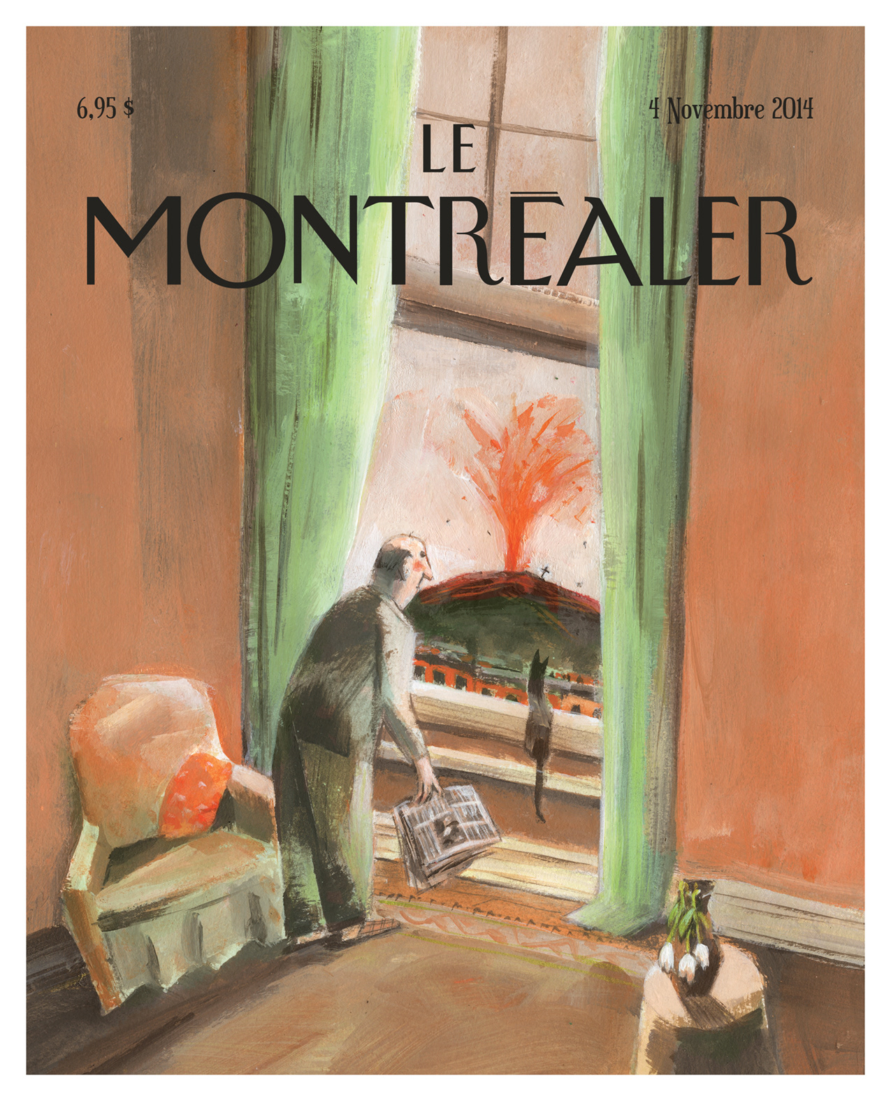 Dans cette oeuvre, l’illustrateur nous propose une vision surréelle où le mont Royal se remet à vivre en étant en éruption. Par le fait même, il nous rappelle que dans la croyance populaire plusieurs pensent que la montagne est un ancien volcan. Au contraire, le mont Royal est l’une des huit collines qui forment la chaîne des Montérégiennes. En fait, la montagne est née il y a environ 125 millions d’années, lors d’une poussée de magma, de la roche en fusion venant du centre de la Terre. Le regard perplexe du chat et de son maître nous démontre l’aspect peu probable de cette hypothèse, qui ne peut prendre place que dans une autre version de cet univers. Les couleurs et la composition sont typiques du style de l’artiste.