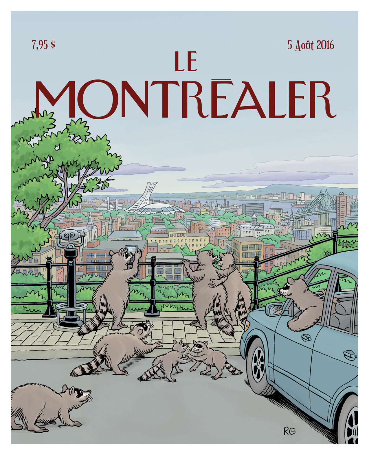 Comme j’ai toujours eu du plaisir à créer des animaux anthropomorphiques, en m’inscrivant dans une certaine tradition en BD, les ratons-laveurs ne représentaient pas un réel problème et étaient plutôt amusants à dessiner. Quand je regarde l’illustration après coup, je trouve qu’ils ont un effet plutôt mignon, presque du dessin pour enfants, même si ce n’était pas vraiment mon intention au départ. Pour moi, l’essentiel du travail réside dans l’élaboration du paysage urbain en arrière-plan. Même si je m’appuie sur une documentation abondante, je ne travaille jamais directement d’après photo. On reconnaît immédiatement le décor montréalais, avec ses principaux points de repère comme le Stade olympique ou le pont Jacques-Cartier, mais c’est un décor reconstitué, synthétisé, interprété, construit en perspective, mais selon une perspective fantaisiste. Techniquement, j’ai travaillé comme je le fais généralement en BD ou en illustration, avec un dessin au trait noir et blanc exécuté sur papier et des couleurs numériques.