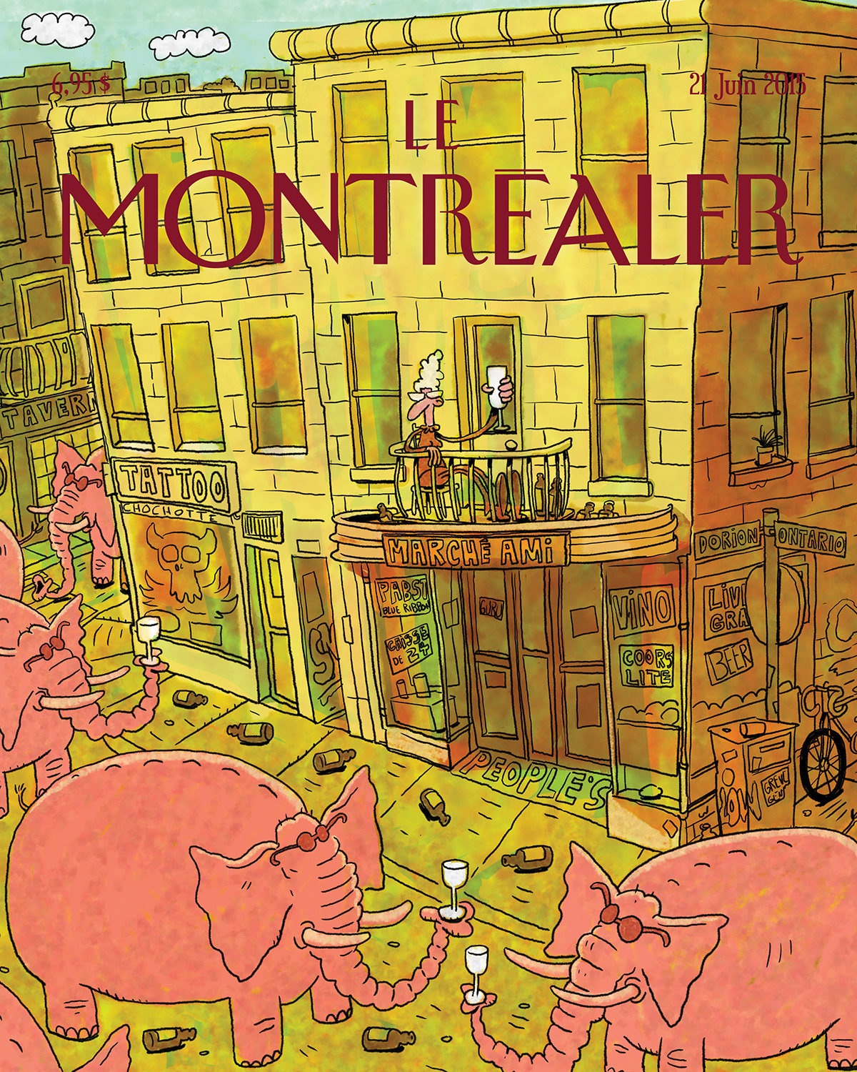 Parce que l’idée de faire la couverture d’une revue fictive est un peu synonyme de liberté totale, un phantasme. Et puis, j’adore l’esthétique des couvertures du New Yorker. J’habite dans le centre-sud de Montréal depuis 25 ans, je me considère donc comme un spécialiste de l’esthétique centre-sudesque, et j’adore les éléphants roses. Ma démarche artistique se résume à trois mots : marcher, observer et dessiner !
