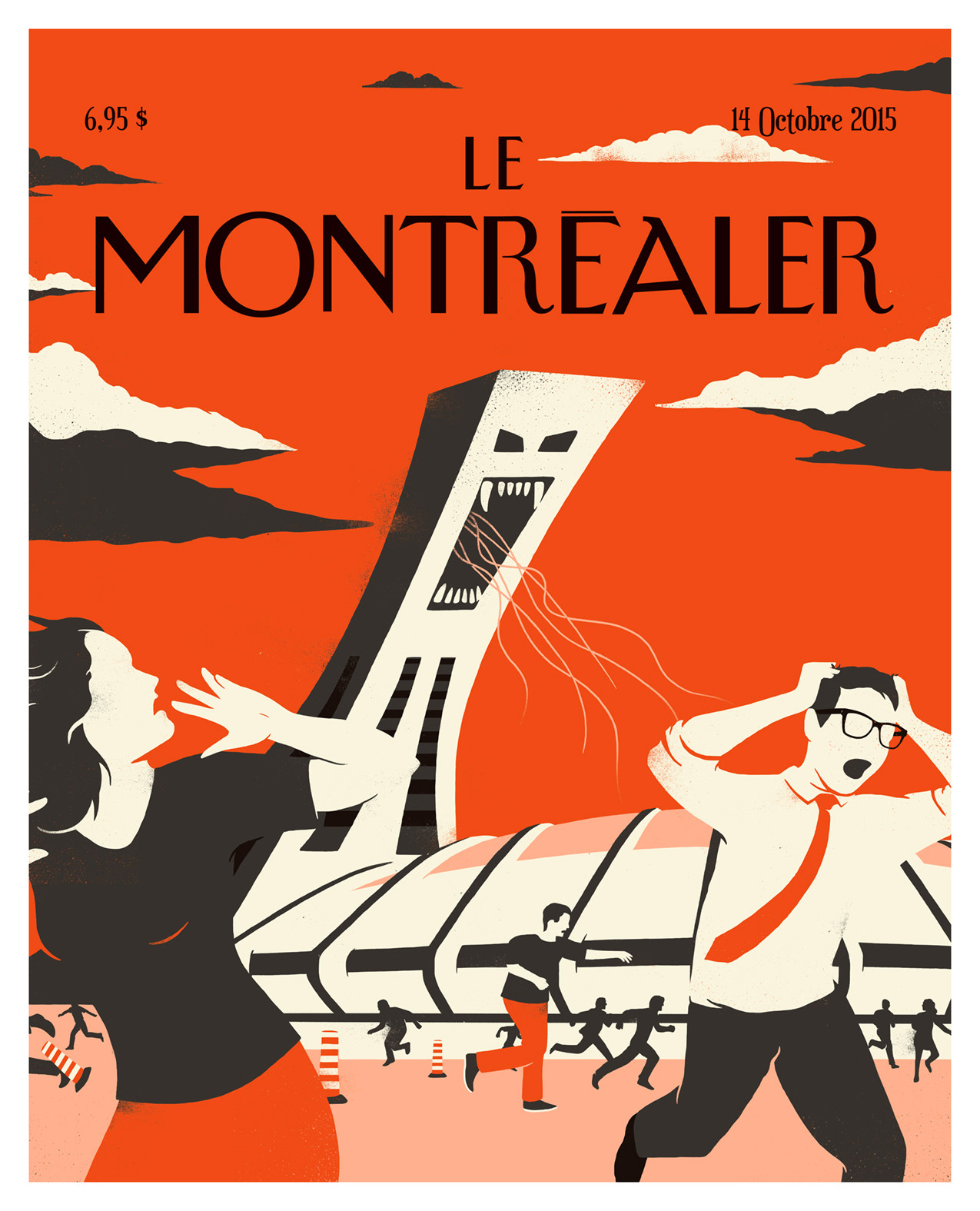 L’artiste nous propose ici une illustration qui montre à la perfection la relation amour-haine qu’entretiennent les Montréalais avec le Stade olympique, créé pour les Jeux olympiques de 1976 par l’architecte français Roger Taillibert. Sa tour de 165 mètres de haut, soutenant 75 % de la charge du toit, est la plus haute structure inclinée au monde.