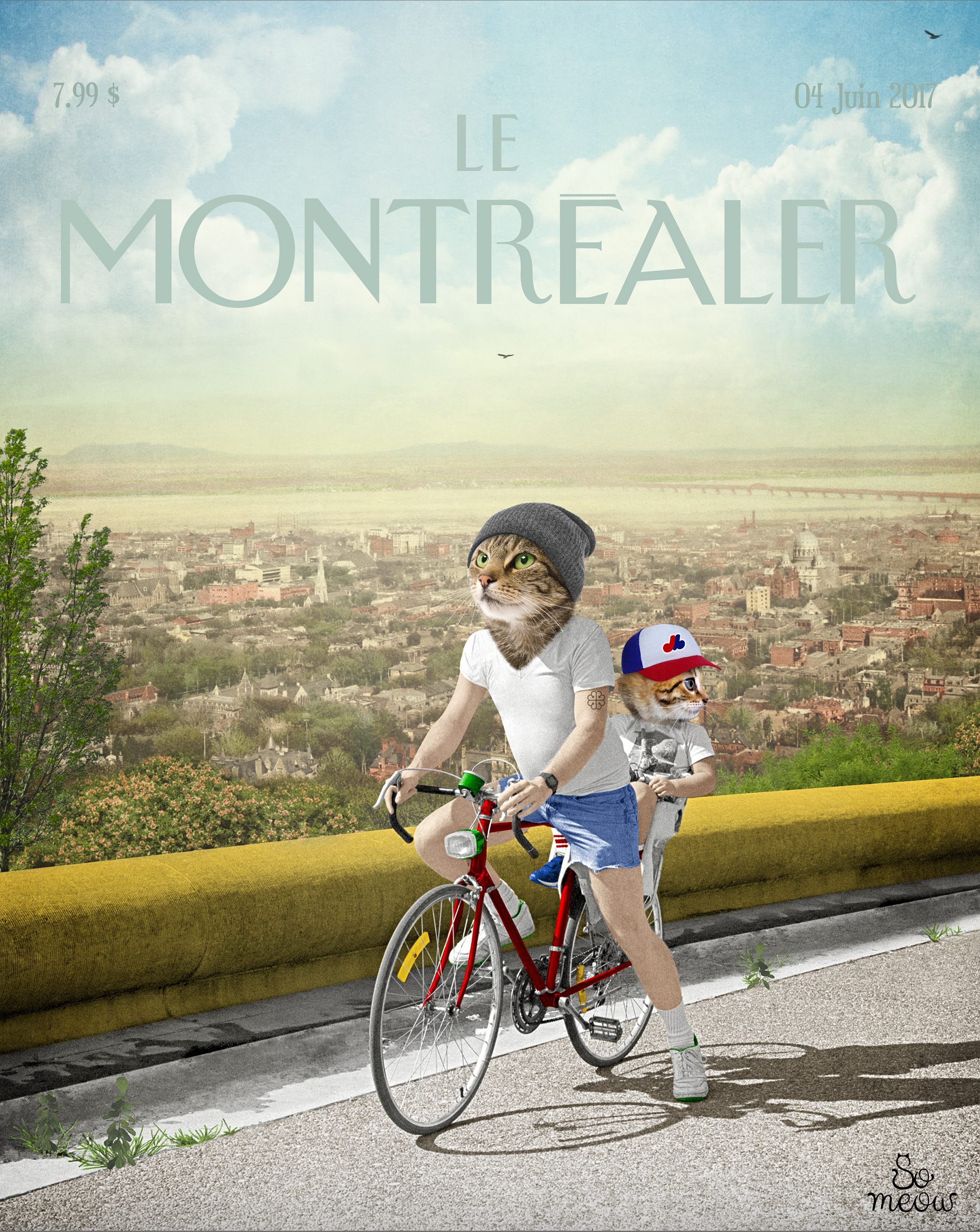 Quant aux sujets, mon époux est un grand cycliste qui traverse la montagne tous les jours pour aller travailler. J’ai donc décidé de le représenter avec notre fils. Ma technique est le collage numérique, et je qualifie mon style d’art félin festif. J’utilise des photos d’archives pour créer de petites histoires ludiques. Tout ce que je crée dans la série So Meow est lié à ma vie, mes réflexions, mes émotions. Chacune de mes images a une signification assez personnelle.